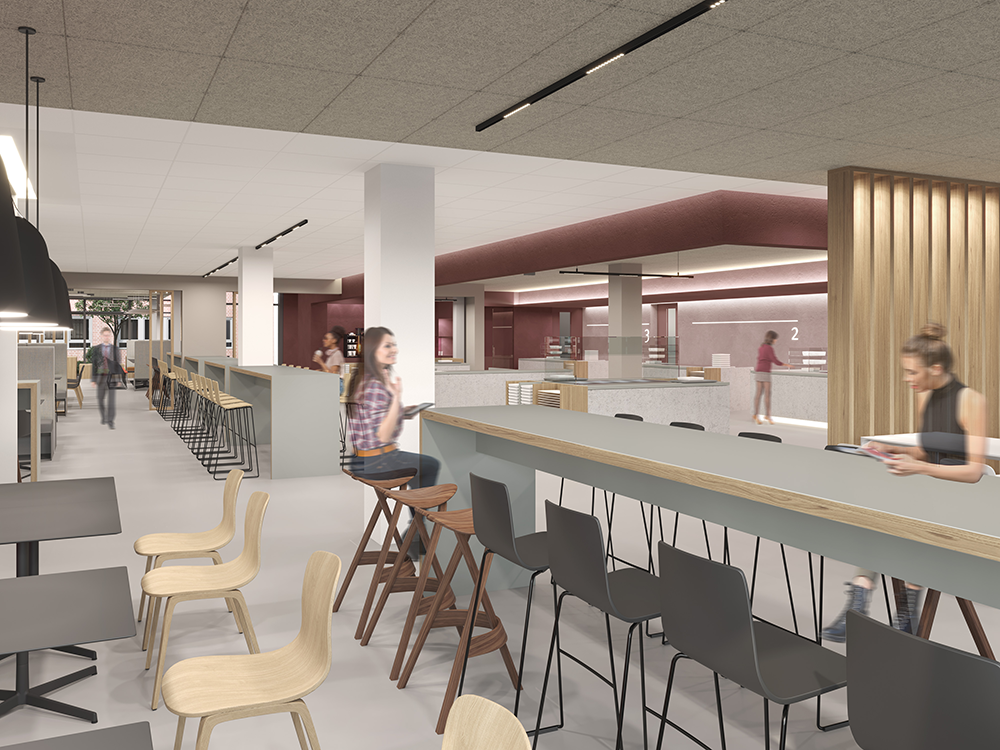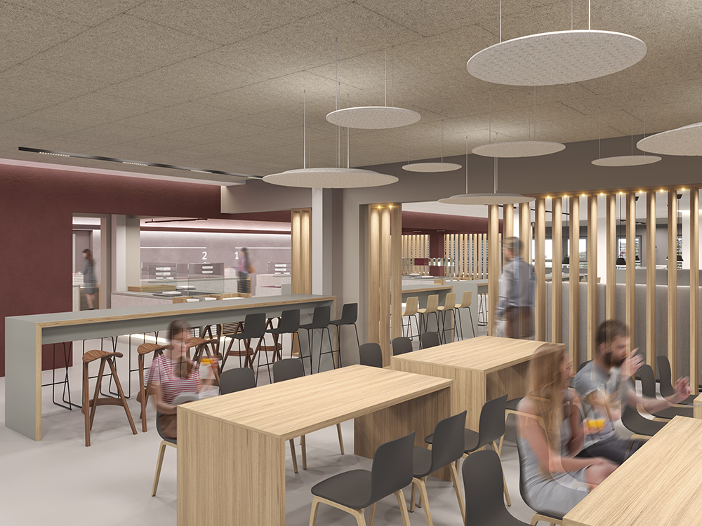 Mit dem neuen Betriebsrestaurant erwartet uns ein angenehmes Ambiente mit gedeckten Farben und Elementen, die Gespräche während der Pause dämpfen. Das Platzangebot hat sich nunmehr verdoppelt: Von ehemals 197 Sitzplätzen, dürfen wir uns auf geräumige 255 im Innenbereich sowie weitere 126 im Außenbereich freuen.